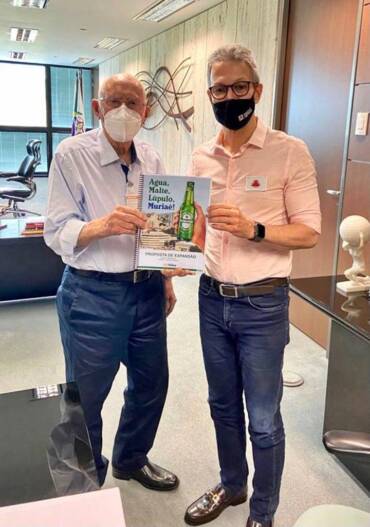 Acompanhado por seu filho, o deputado estadual Braulio Braz, o prefeito de Muriaé apresentou a Zema o projeto do município para receber a fábrica da cervejaria Heineken, que procura sede para se instalar em Minas Gerais.