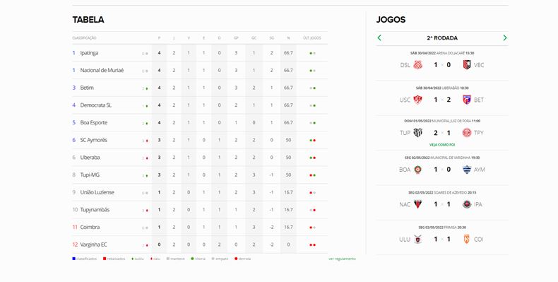 Nacional de Muriaé empataram em 1 a 1, na noite desta segunda-feira, no Soares de Azevedo, em Muriaé. O confronto foi válido pela 2ª rodada do Módulo 2 do Campeonato Mineiro. Com o resultado, as duas equipes chegam a quatro pontos e dividem a liderança da primeira fase. Confira a tabela de Classificação abaixo: