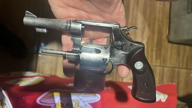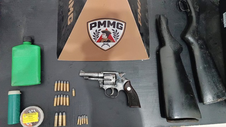 No local, durante as buscas, os militares localizaram um fundo falso em um armário da cozinha. No esconderijo, foi encontrado um revólver calibre .32, além de munições de diversos calibres, pólvora, espoletas e outros insumos para recarga.