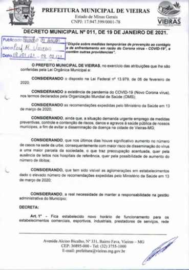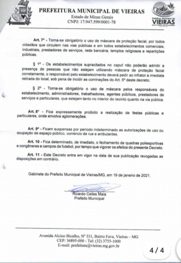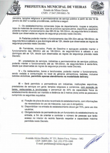 O Prefeito Municipal de Vieiras, Ricardo Maia, publicou nesta terça-feira (19), o Decreto Municipal nº 011/2021, que “dispõe sobre as medidas temporárias de prevenção ao contágio e de enfrentamento em razão do Coronavírus – Covid-19, e contém outras providências”.