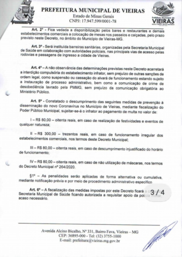 Fica vedada a disponibilização pelos bares e restaurantes e demais estabelecimentos comerciais a colocação de mesas nos passeios e calçadas, pelo prazo previsto neste Decreto, no âmbito do Município de Vieiras-MG.