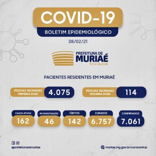 Além disso, o Governo de Minas anunciou ontem que recebeu mais 315.600 doses da vacina produzida pelo Instituto Butantan. No entanto, ainda não foi informado quantas delas serão encaminhadas para Muriaé.