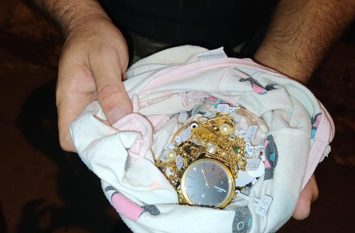 Outra mulher também estava na casa, usando um par de brincos, relatando que ganhou da moradora, companheira do suspeito, material reconhecido pela vítima do roubo. Na laje de uma casa dos fundos, desabitada foi localizada também envolvida em uma blusa de pijama, grande quantidade de joias, também reconhecida pelo proprietário da relojoaria. Por um terreno onde o suspeito passou, mais joias encontradas, e uma mochila de criança. Quatro crianças estavam na casa, sendo acionado o Conselho Tutelar que as encaminharam para a Casa Lar.