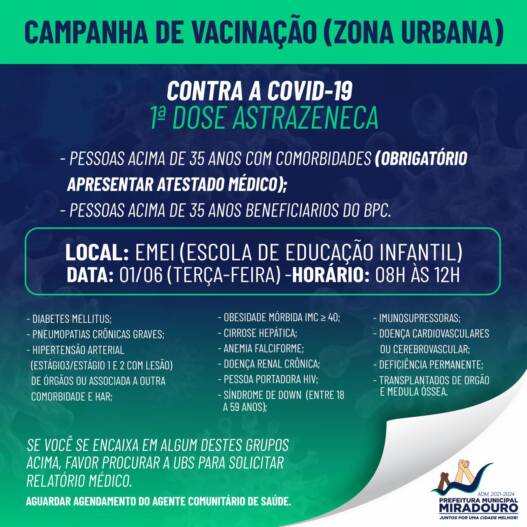 A Secretaria Municipal de Saúde de Miradouro pede a todos os munícipes que permaneçam o máximo possível em suas casas e que, ao saírem, tomem todas as medidas de prevenção necessárias como o uso da máscara e a higienização das mãos com álcool gel. Cuidando de você, você estará cuidando de todos à sua volta para que no futuro possamos voltar a normalidade.