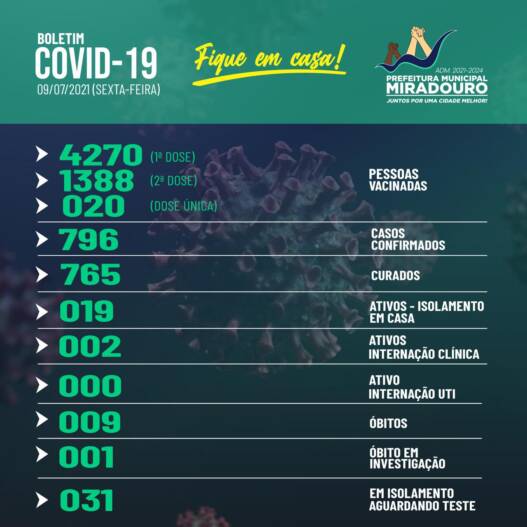 Confira abaixo o boletim epidemiológico, desta sexta-feira (09/07/2021).