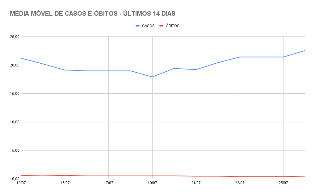 A média móvel atual, considerando dados das últimas duas semanas, é de 22,57 casos por dia. O índice é 6,41% mais alto que o de 14 dias atrás – a variação está dentro do patamar de estabilidade quando é de até 15% (tanto para mais quanto para menos).
