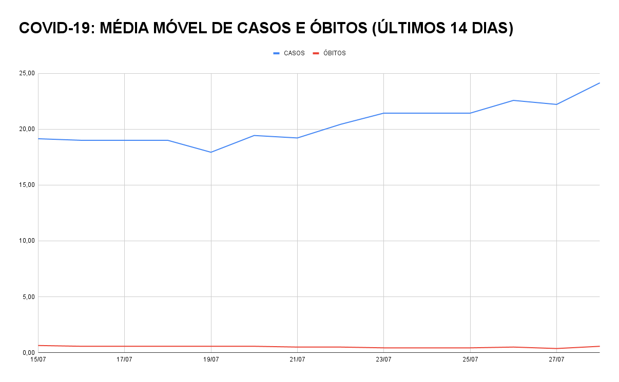 A média móvel atual, considerando dados das últimas duas semanas, é de 24 casos por dia. O índice é 26% superior ao de 14 dias atrás,confirmando a tendência de aumento que vinha sendo verificada nos últimos dias.