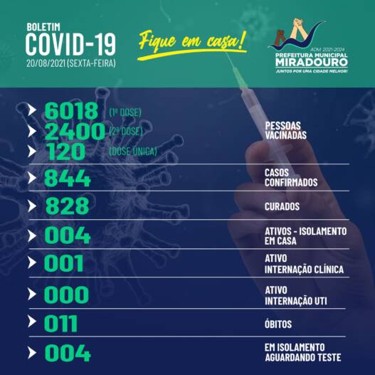 Confira abaixo o boletim epidemiológico, desta sexta-feira (20/08/2021).
