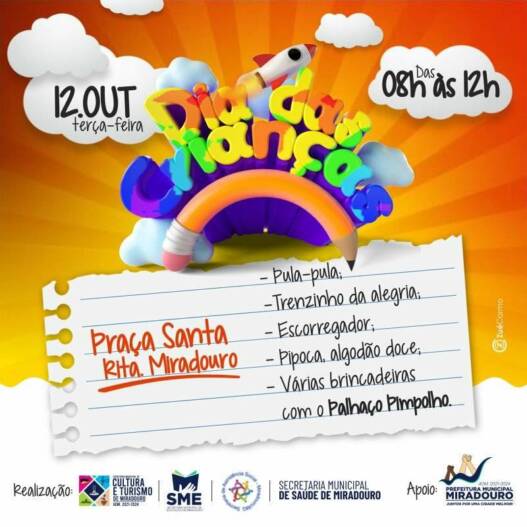 PREFEITURA PROMOVE FESTA EM COMEMORAÇÃO AO DIA DAS CRIANÇAS EM MIRADOURO AGENDA CULTURAL Destaque EVENTOS 7 de outubro de 2021 Portal MiradouroSeja o primeiro a comentar on PREFEITURA PROMOVE FESTA EM COMEMORAÇÃO AO DIA DAS CRIANÇAS EM MIRADOURO
