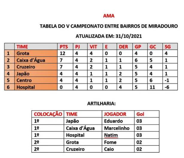 Daqui a pouco a tabela atualizada do Campeonato de Bairros de Miradouro na íntegra para vocês.