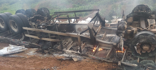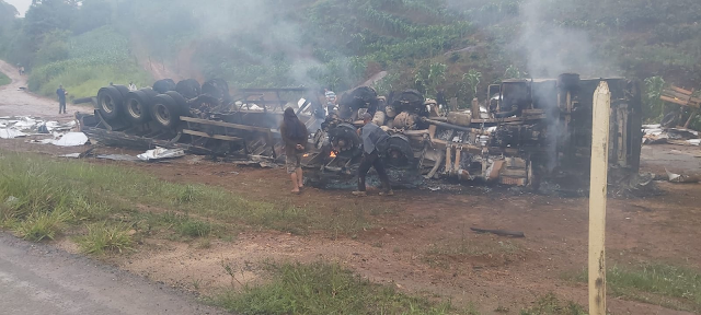Uma carreta carregada com placas de alumínio capotou e pegou fogo na manhã desta quarta-feira (08), na “Curva do Deus me Livre”, BR-116, em Divino.