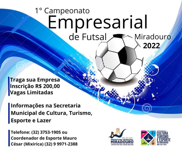 A Prefeitura de Miradouro, através da Secretaria Municipal de Cultura, Turismo, Esporte e Lazer vai realizar o 1° Campeonato Empresarial de Futsal de Miradouro 2022.