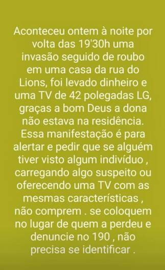 A Polícia Militar de Miradouro foi acionada na manhã desta quinta-feira (20-01), para comparecer na Rua Capitão Antônio Bernadinho (Rua dos Lions). No local os militares foram informados pela proprietária da residência que ao retornar para casa se deparou com os vidros da janela e porta quebrados. O morador contou aos policiais que estava fora de casa e quando voltou viu a situação. Foram levados uma TV LG de 42 polegadas e uma quantia em dinheiro.