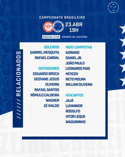 Brasileirão Série B: Cruzeiro divulga os relacionados para o jogo contra o Tombense em Muriaé Destaque ESPORTE 22 de abril de 202222 de abril de 2022 Portal MiradouroSeja o primeiro a comentar on Brasileirão Série B: Cruzeiro divulga os relacionados para o jogo contra o Tombense em Muriaé EM MURIAÉ, NO ESTÁDIO SOARES DE AZEVEDO