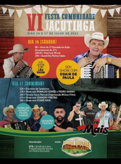 Confira na programação! A poeira vai levantar na Jacutinga! Você não pode perder essa festa! Venha, participe, traga os seus convidados, por que serão dois dias de pura alegria e diversão! A Jacutinga é linda demais e estará te esperando de braços abertos! Compartilhe! Pega a ideia e…. Xama