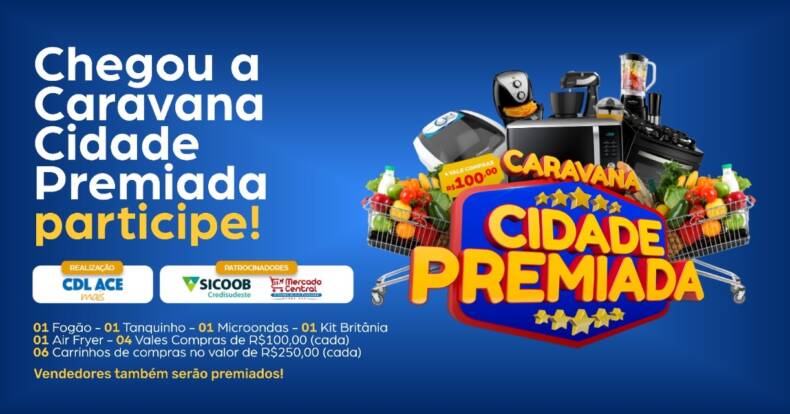A CDL ACE Mais está promovendo mais uma super ação PROMOCIONAL, a CARAVANA CIDADE PREMIADA. Comprando nas lojas PARTICIPANTES você preenche o seu cupom e é só depositar na urna e torcer para ganhar.