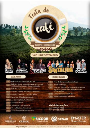 No dia 10 também haverá palestras sobre certificação e educação financeira, além de apresentações culturais e shows musicais. Um dos organizadores do evento, João Silvério Pereira Cassin é atendido pelo ATeG Café+Forte oferecido em parceria com o Sindicato dos Produtores Rurais de Eugenópolis e destacou que a festa está sendo retomada para “valorizar e incentivar os produtores rurais e o carro chefe da nossa economia que é o café. Além de proporcionar momentos de cultura, lazer à comunidade”.