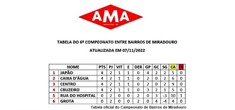 TABELA DO CAMPEONATO DE FUTEBOL ENTRE BAIRROS DE MIRADOURO