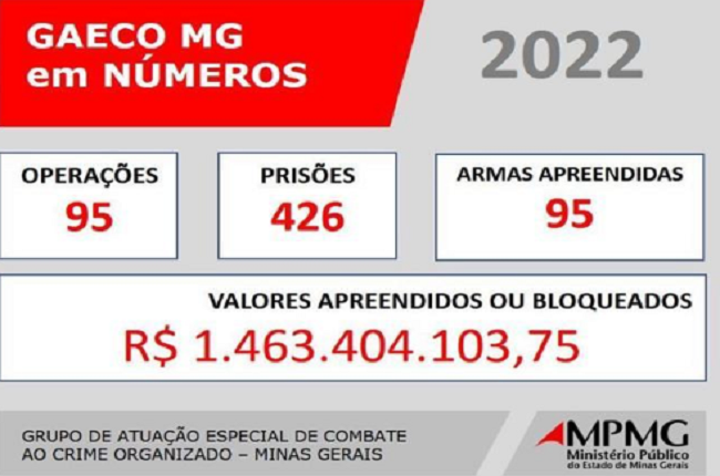 O Grupo de Atuação Especial de Combate ao Crime Organizado (Gaeco), do Ministério Público de Minas Gerais (MPMG), divulgou nesta quarta-feira, 7 de dezembro, um balanço do trabalho desenvolvido ao longo do ano de 2022.