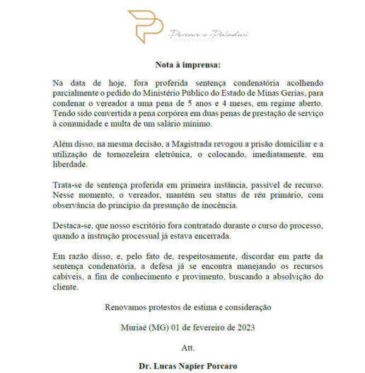 Os advogados de defesa, Dr. Lucas Napier Porcaro e Dr. Marcos Paladini enviaram Nota Oficial para a imprensa dando mais detalhes da sentença.
