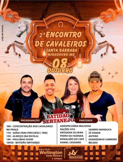 ATENÇÃO GALERA DO CHAPÉU! VEM AÍ 2º ENCONTRO DE CAVALEIROS EM SANTA BÁRBARA, COM SHOW COM A BANDA BATIDÃO SERTANEJO Destaque 4 de outubro de 20234 de outubro de 2023 Portal MiradouroSeja o primeiro a comentar on ATENÇÃO GALERA DO CHAPÉU! VEM AÍ 2º ENCONTRO DE CAVALEIROS EM SANTA BÁRBARA, COM SHOW COM A BANDA BATIDÃO SERTANEJO