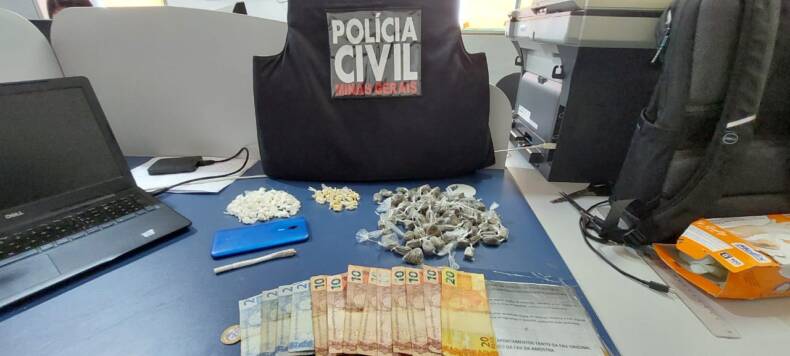 Não houve reação. Nas buscas realizadas foi localizada vasta quantidade de drogas, entre cocaína (69 papelotes), maconha (99 buchas) e crack (32 pedras), além de anotações referente ao tráfico de drogas.