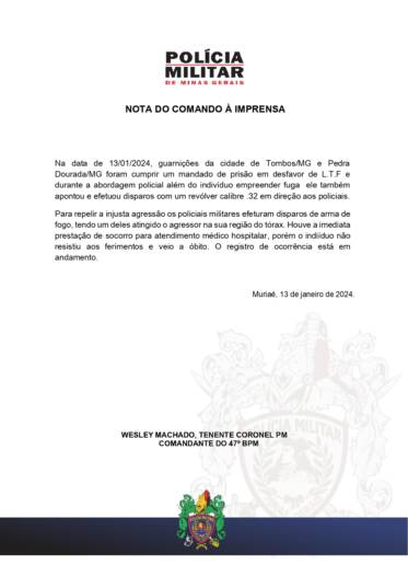 UM HOMEM DE 37 ANOS MORREU NA MANHÃ DESTE SÁBADO, DIA 13 DE JANEIRO, NA CIDADE DE PEDRA DOURADA. SEGUNDO INFORMAÇÕES DA PM, OS MILITARES DE TOMBOS E PEDRA DOURADA, FORAM CUMPRIR UM MANDADO DE PRISÃO EM DESFAVOR DE L.T.F E DURANTE A ABORDAGEM O INDIVÍDUO EMPRRENDEU FUGA E APONTOU E EFETUOU DISPAROS COM UM REVÓLVER CALIBRE 32 CONTRA OS MILITARES. PARA REPELIR A INJUSTA AGRESSÃO OS MILITARES EFETUARAM DE ARMA DE FOGO, TENDO UM DELES ATINGIDO O AGRESSOR NA REGIÃO DO TÓRAX. O CIDADÃO FOI SOCORRIDO PELOS MILITARES E ENCAMINHADO PARA O HOSPITAL PRÓXIMO, PORÉM NÃO RESISTIU AOS FERIMENTOS E VEIO A ÓBITO.