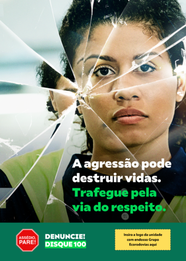 Com o mote “trafegue pela via do respeito!”, as peças da campanha fazem um paralelo com acidentes de trânsito e mostram personagens através de um vidro quebrado, o que sugere o quanto casos de assédio podem destruir a vida de uma pessoa. O material foca na conscientização e vem sendo aplicado nas 11 concessionárias do grupo, em locais como bases de atendimento ao usuário, cabines de pedágio, cancelas e faixas nas rodovias – em todos há a indicação do “Disque 100” como canal oficial para denúncias. A campanha também inclui uma cartilha com orientações, podcast, websérie, posts em redes sociais e mídia externa, além de diversas ações offline.