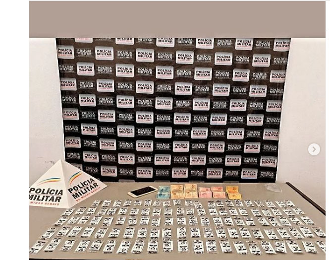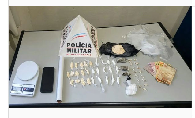 15 pedras de crack, 28 papelotes de cocaína, 3 tabletes de maconha, 01 bucha maconha, 01 porção grande cocaína para dolar, 01 pedra fragmentada de pasta base cocaína, R$ 130, diversas embalagens de “sacole” para embalar droga em pó, 01 rolo papel filme, 01 balança de precisão e 01 aparelho celular” informa a PM.