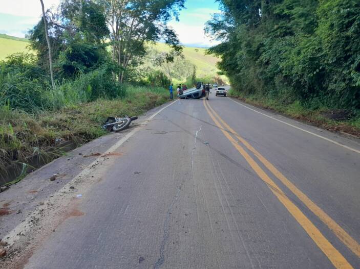 Colisão entre motocicleta e automóvel deixa três pessoas feridas na MGC 482 próximo de Fervedouro