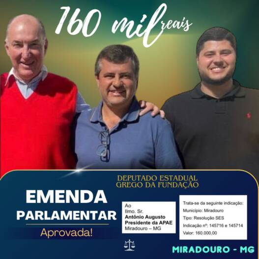 O Deputado Grego, autor da emenda, expressou seu entusiasmo com a aprovação da indicação e reiterou seu compromisso com a causa da inclusão social. “Investir na APAE de Miradouro é investir em um futuro mais justo e igualitário. Estou muito satisfeito por poder contribuir com este importante trabalho e espero continuar apoiando iniciativas que fortaleçam nossa sociedade como um todo”, afirmou o deputado.