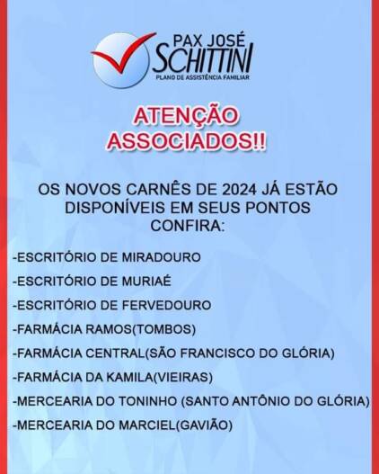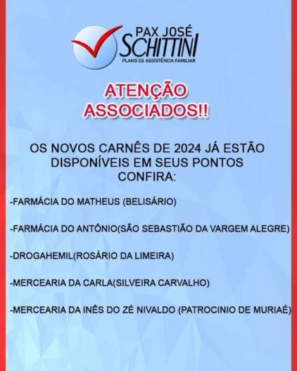 COMUNICADO IMPORTANTE DA PAX JOSÉ SCHITTINI PARA SEUS ASSOCIADOS: OS NOVOS CARNÊS DE 2024 JÁ ESTÃO DISPONÍVEIS Destaque 23 de maio de 202425 de maio de 2024 Portal MiradouroSeja o primeiro a comentar on COMUNICADO IMPORTANTE DA PAX JOSÉ SCHITTINI PARA SEUS ASSOCIADOS: OS NOVOS CARNÊS DE 2024 JÁ ESTÃO DISPONÍVEIS