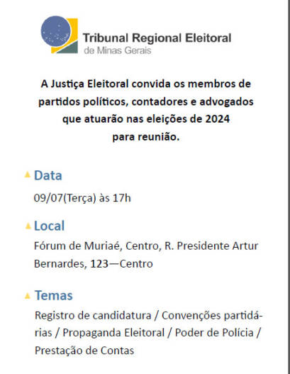 Eleições 2024: Cartório Eleitoral de Muriaé fará reunião com representantes de partidos nesta terça-feira Destaque Eleições 2024 8 de julho de 20248 de julho de 2024 Portal MiradouroSeja o primeiro a comentar on Eleições 2024: Cartório Eleitoral de Muriaé fará reunião com representantes de partidos nesta terça-feira