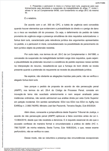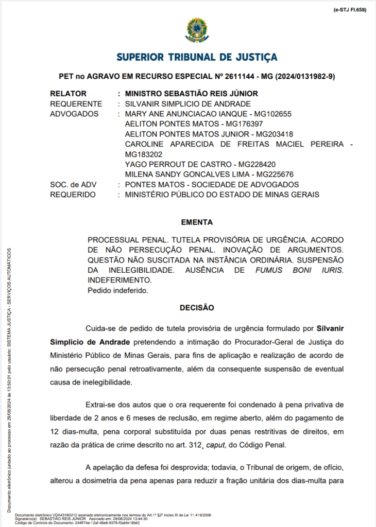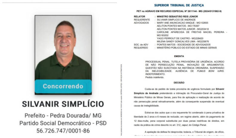 Em resposta à decisão do Ministério Público, Silvanir Simplício recorreu ao Superior Tribunal de Justiça (STJ) na quinta-feira (29), apresentando um Agravo em Recurso Especial e solicitando uma tutela provisória de urgência para suspender a inelegibilidade e permitir sua candidatura. No entanto, o Ministro Sebastião Reis Júnior, ao analisar o pedido, decidiu que não estavam presentes as circunstâncias excepcionais que justificariam a concessão da tutela de urgência. Assim, a decisão do STJ manteve Silvanir Simplício em situação de inelegibilidade.