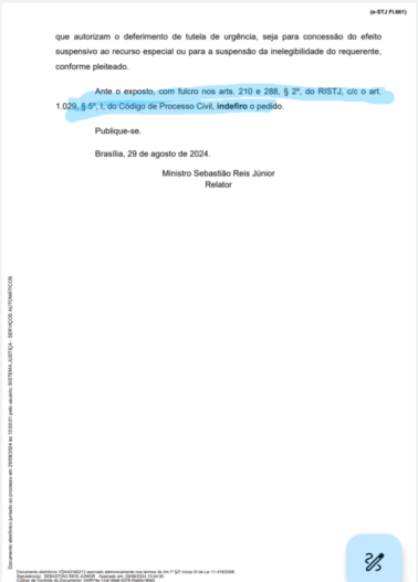 A decisão do STJ, com base nos artigos 210 e 288, § 2º, do RISTJ e no artigo 1.029, § 5º, I, do Código de Processo Civil, indeferiu o pedido de Silvanir. Portanto, sua candidatura à Prefeitura de Pedra Dourada permanece em situação de impedimento.
