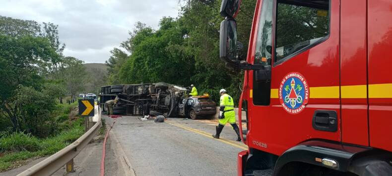 Na tarde dessa terça-feira, dia 15 de outubro, por volta das 15:00h, o Corpo de Bombeiros atendeu a um grave acidente na BR 040, próximo ao km 765. No local, o motorista de um caminhão-baú, que seguia no sentido Barbacena/Juiz de Fora, após perder o controle direcional do veículo bateu na mureta de contenção da rodovia e logo em seguida invadiu a pista e tombou sobre o veículo de passeio Honda HRV que seguia no sentido contrário.