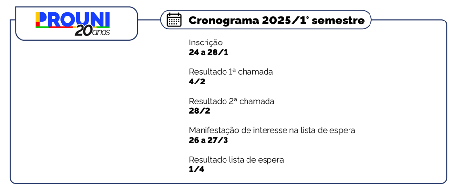 Prouni 20 anos – Criado em 2004, pela Lei nº 11.096/2005, o Programa Universidade Para Todos (Prouni) oferta bolsas de estudo (integrais e parciais) em cursos de graduação e sequenciais de formação específica, em instituições de educação superior privadas. O programa ocorre duas vezes ao ano e tem como público-alvo o estudante sem diploma de nível superior. Em 2025, o Prouni comemora 20 anos de existência, com mais de 3,4 milhões de estudantes beneficiados entre 2005 e 2024.