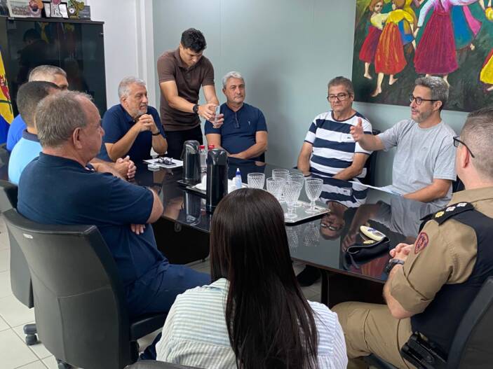 O prefeito de Muriaé recebeu uma comitiva de empresários e lojistas, dentre eles o presidente da CDL/ACE Mais de Muriaé, Eduardo Monteiro, Fernando César Lopes (15ª Região Litúrgica da Maçonaria); Vitor Santos, gerente geral da CDL; os secretários municipais de Desenvolvimento Econômico e Inovação Social; César Augusto Bianchi Botaro, de Desenvolvimento Social, Vanessa Magalhães e Governo, Paulo Varela; os militares Maj/PM Straus; Cap/PM Reinaldo Laviola e Ten/PM Anderson; além do vereador Léo Pereira e o superintendente Júlio Simbra para tratarem do aumento de casos de furto a estabelecimentos comerciais na cidade.