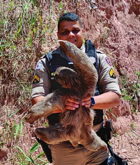 Na manhã desta terça-feira (18), moradores da Rua Achiles de Almeida Junior, em Fervedouro, acionaram a polícia após avistarem um animal da fauna silvestre dentro de uma residência. Ao chegarem ao local, a equipe policial, composta pelos Sgt. Silva e Sgt. Tornel, se deparou com um Bicho-Preguiça, que estava aparentemente em situação de risco.