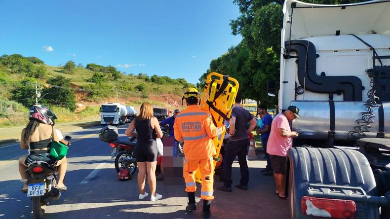 Colisão entre moto e carreta deixa dois feridos na BR 116, próximo da entrada do bairro Gaspar em Muriaé