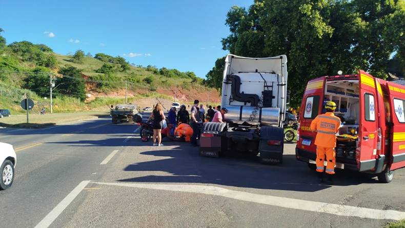 Colisão entre moto e carreta deixa dois feridos na BR 116, próximo da entrada do bairro Gaspar em Muriaé