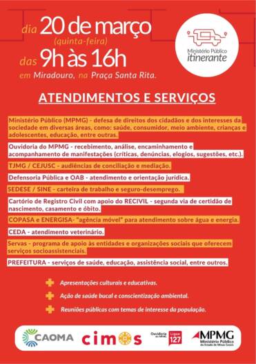 Em todas essas cidades, será montada estrutura do MP Itinerante e de seus parceiros, composta por unidades móveis, tendas e estandes. Serão oferecidos: atendimento por Promotorias de Justiça do MPMG em diversas áreas, como cidadania, cível, criminal, meio ambiente, direitos humanos, entre outras; registro de manifestações (críticas, denúncias, elogios, solicitações e sugestões), análise e encaminhamento da Ouvidoria das Mulheres e da Ouvidoria do MPMG; atendimento jurídico; realização de audiências de conciliação e mediação; orientação sobre benefícios previdenciários; emissão de segundas vias das certidões de nascimento, casamento e óbito; atendimento veterinário; ações de atenção primária à saúde, como aferição de pressão, entre outros.