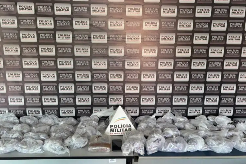 Na bagagem do suspeito, foram encontrados 2.100 pinos de cocaína e uma barra de maconha, todos embalados e etiquetados para venda.