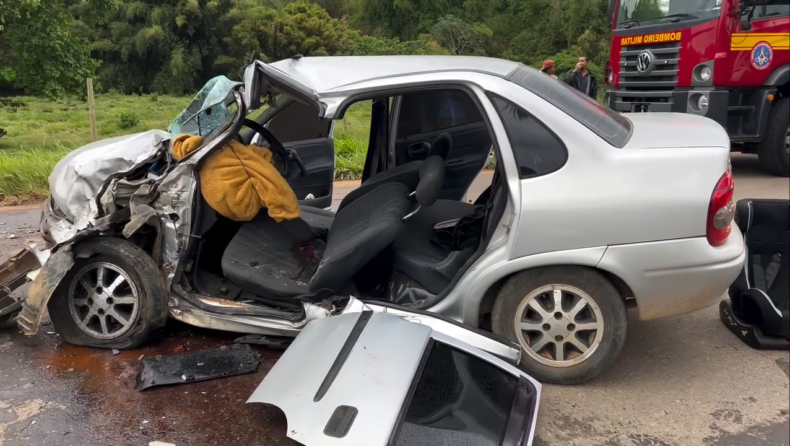 No veículo de passeio estavam quatro ocupantes — três adultos e uma criança —, enquanto a van transportava duas pessoas no momento do impacto. Com a força da batida, o motorista do Corsa ficou preso às ferragens e precisou ser retirado com o auxílio do Corpo de Bombeiros.