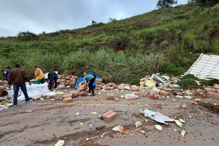 Populares que passavam pelo local se mobilizaram e ajudaram na remoção da carga espalhada pela pista, contribuindo para a liberação do fluxo de trânsito.