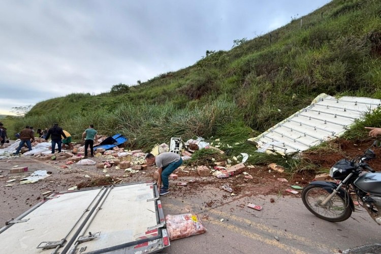 Com o impacto, a carroceria do tipo baú ficou completamente destruída, espalhando a carga de carne pelo asfalto. A situação provocou a interdição parcial da rodovia, dificultando o tráfego de veículos na região.