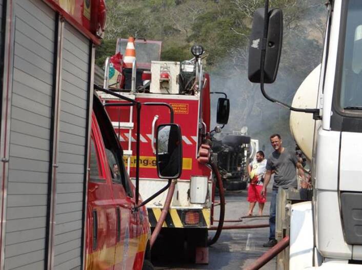Carreta carregada de vidro tomba e pega fogo na BR 116, na Serra do Belvedere.