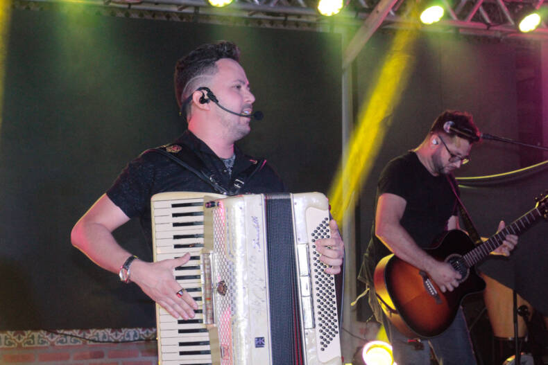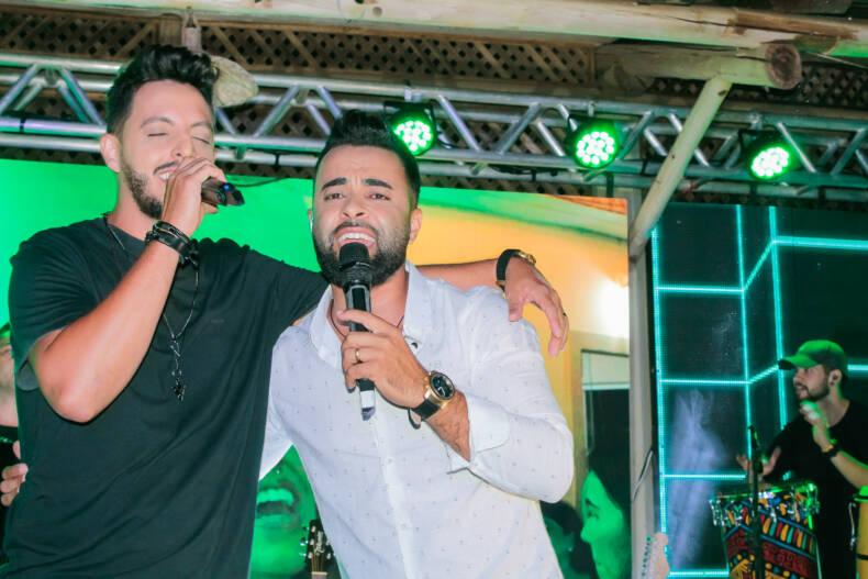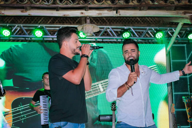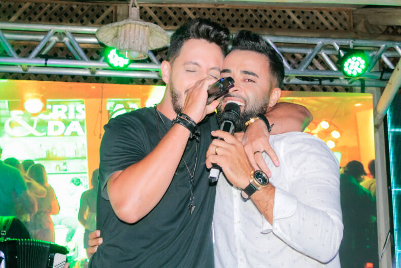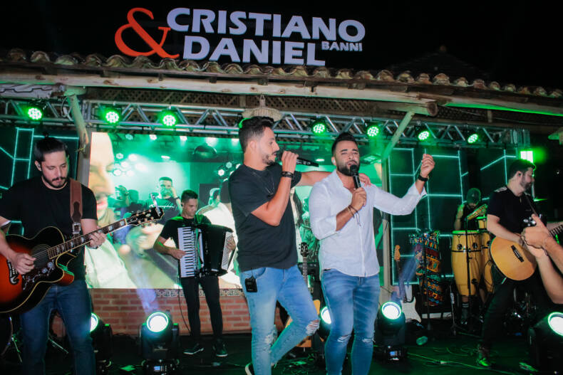 O palco aberto teve como tema, claro, Arruaça, que é o novo sucesso da dupla Cristiano Bani e Daniel, mas o animado público só esperou a abertura do show para degustar a famosa cachaça mineira no pé do palco, e os simpáticos e talentosos cantores participaram da brincadeira.
