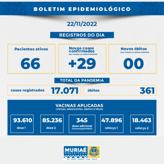 Covid-19: Novo boletim mostra 66 pacientes ativos em Muriaé