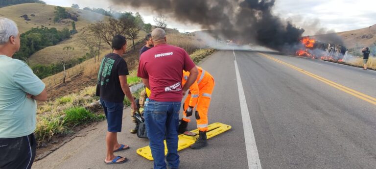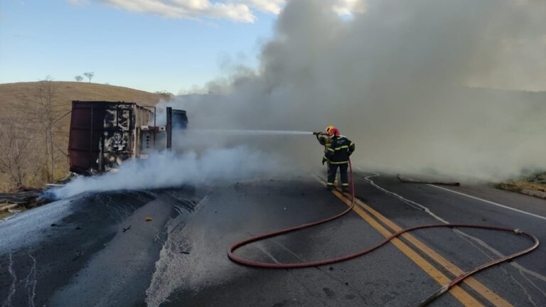 Carreta carregada com café tomba e pega fogo na Serra do Belvedere na tarde deste domingo (18-09)